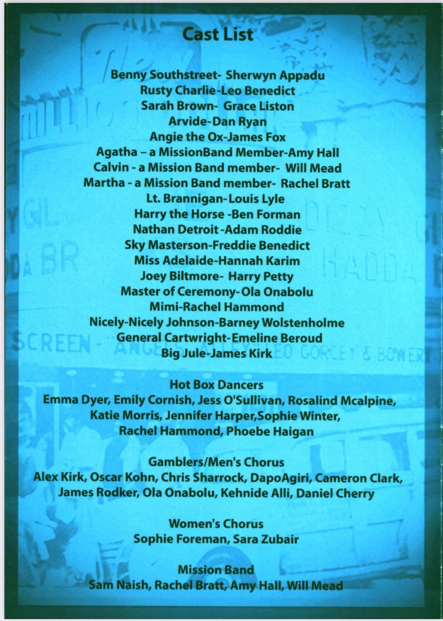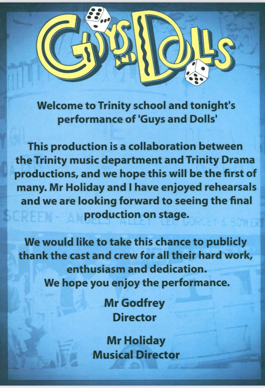Grace Liston (L6) said: “Being involved with Guys and Dolls at Trinity has been a thoroughly enjoyable and rewarding experience. I think that participating in the musical was the best way to introduce me to the astounding music and drama department available at Trinity”. Freddie Benedict (L6) added: “Despite never having been in a musical before, I have really enjoyed Guys and Dolls. It’s been an amazing show to perform in!”